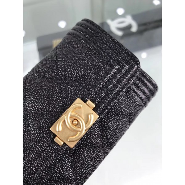 AAA Chanel Grained Calfskin Boy Flap Card Holder A80603 Black/Gold AQ03605