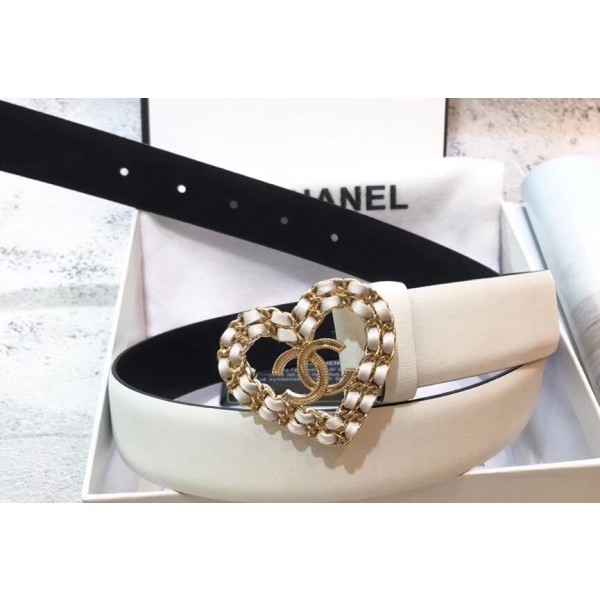 Chanel Width 3cm Chain Heart CC Logo Buckle Leather Belt White AQ02706