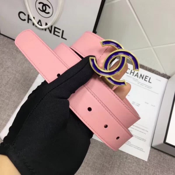 Designer Chanel Calf Leather Belt with Blue Buckle 30mm Width Pink 2018 AQ03637
