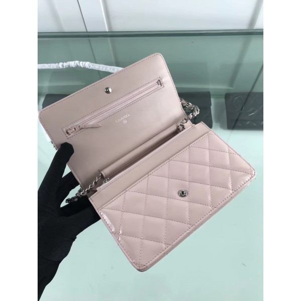 Designer Imitation Chanel Wallet On Chain WOC Bag in Patent Leather Nude Pink/Silver AQ00680