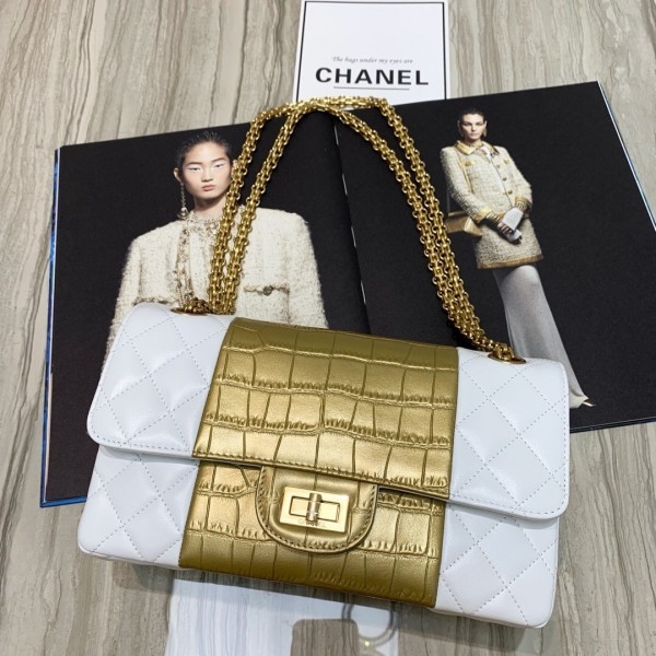 Knockoff Luxury Chanel Lambskin and Crocodile Embossed Calfskin Medium 2.55 Flap Bag A37586 White/Gold 2019 Collection AQ02098