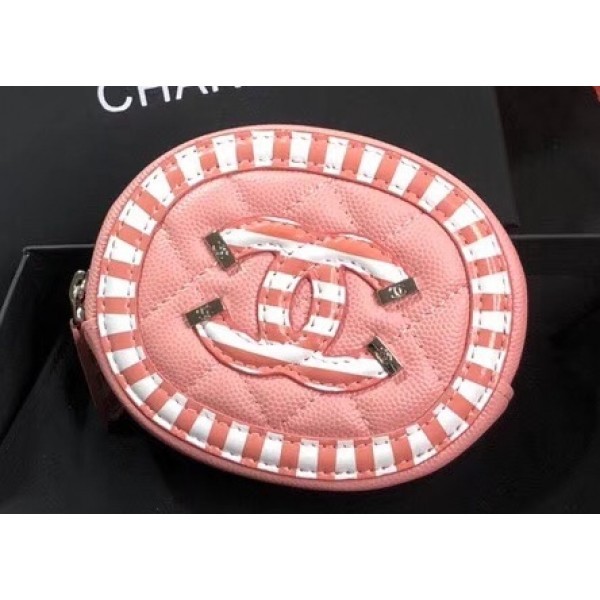 Replica Chanel Striped Grained Calfskin CC Filigree Round Zipped Coin Purse A81458 Pink 2019 AQ01341