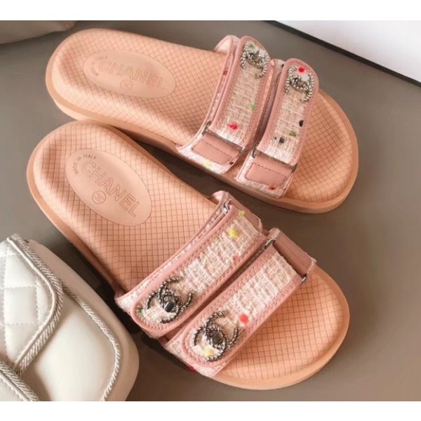 Replica Chanel Tweed CC Logo Magic Loop Mules Slipper Sandals Pink 2020 AQ03455